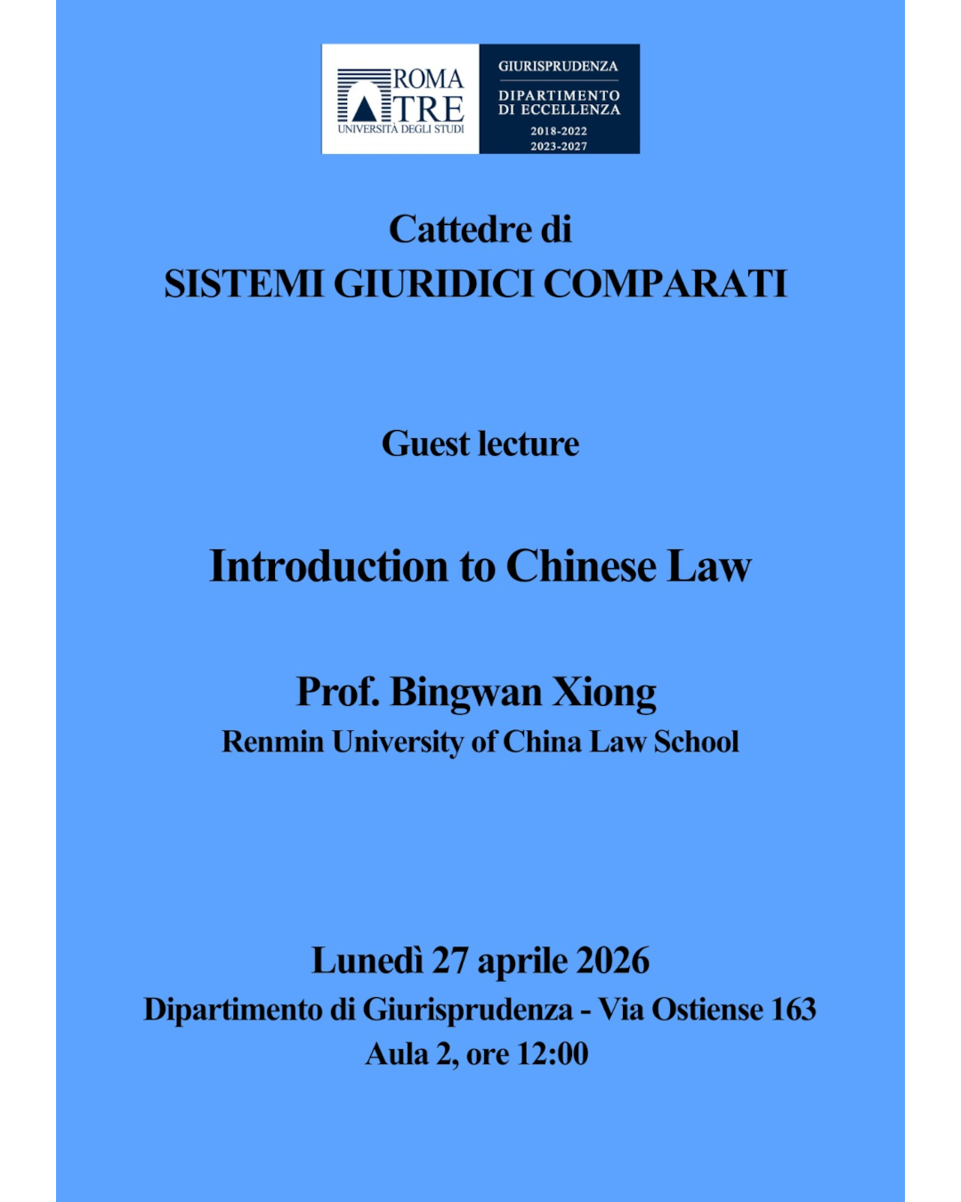 Introduction to Chinese Law Cattedre di Sistemi Giuridici ComparatiGuest lectureProf. Bingwan Xiong - Renmin University of China Law SchoolLunedì 27 aprile 2026, aula 2, ore 12Link identifier #identifier__8017-1Locandina Skip back to navigation